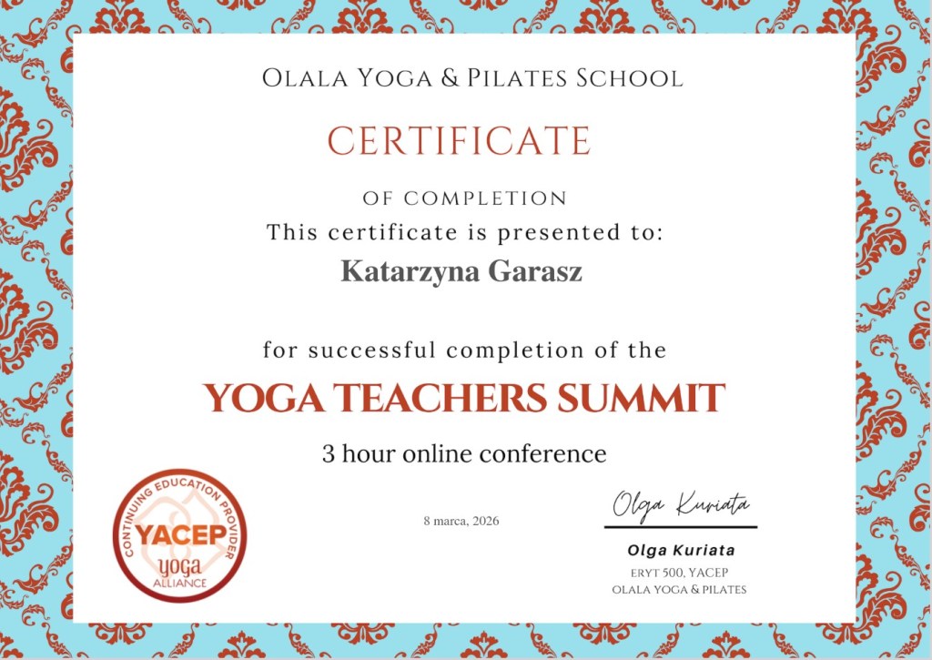 Dyplomy Poniżej znajdziesz wszystkie moje dyplomy, certyfikaty i uprawnienia związane z jogą, medytacją lub pranajamą. Legitymacja instruktorska PAKiS Dyplom PAKiS Neuromeditation Level 1 Trainer Swiadectwo PAKiS Zaświadczenie PAKiS Certyfikat PAKiS Yoga Alliance Yin Yoga Teacher Yoga Alliance RYT200 Teacher Pranajama Himalajska Yoga Alliance Vinyasa Krama Certificate Yoga Alliance Restorative Certificate Yoga Alliance Advance your teaching Certificate Yoga Alliance Neuro Yoga Certificate Yoga Alliance Yoga for Spine Certificate Yoga Alliance Yoga for Athletes Yoga Alliance Yoga for Seniors Yoga Alliance Yoga for Menopause Yoga Alliance Meridiany Yoga Alliance Pranajama Yoga Alliance Anatomia Yoga Alliance Teachers Summit